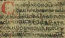 Detail rukopisu s iniciálou „C“, strana 2, verše 12–17 (necelé)