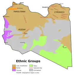 Většina libyjské populace je dnes označena jako arabská, tj. arabsky mluvící a arabsky „pěstovaná“. Významnou menšinou jsou Berberští Libyjci. V Libyi je asi 140 kmenů a klanů.[35]
