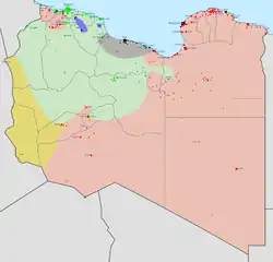 V roce 2019 velkou část země ovládala samozvaná Libyjská národní armáda (LNA) generála Chalífy Haftara, která bojovala s vládou premiéra Faíze Sarrádže v Tripolisu, za níž stála OSN.[23] Libye slouží jako hlavní tranzitní země pro migranty ze subsaharské Afriky směřující do Evropy.[24]