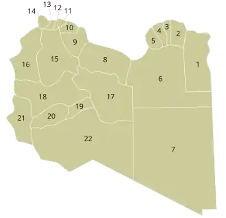 Po získání nezávislosti v roce 1951 byla Libye federací 3 historických zemí: Tripolsko na severozápadě, Kyrenaika na východě a Fezzán na jihozápadě. Federativní uspořádání bylo zrušeno v roce 1963. Od roku 2007 Libye sestává z 22 okresů (arabský výraz shabiyah, شعبية).