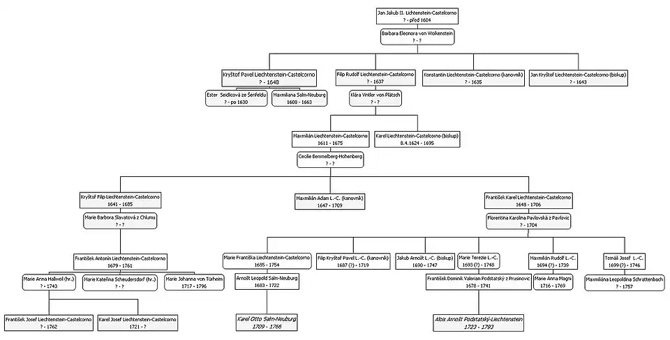- Jakub Arnošt z Lichtensteinu-Castelcorna (1690–1747), nejstarší syn Františka Karla, byl biskupem v Seckau, biskupem v Olomouci a arcibiskupem v Salcburku.