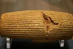 Kýrův válec z Babylonie (538 př. n. l.), obvykle považovaný za „první zápis lidských práv“