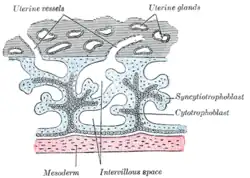 Později se trofoblast dá rozlišit na dvě odlišné vrstvy, cytotrofoblast, a syncytiotrofoblast (plasmoditrofoblast). Cytotrofoblast je vnitřní vrstva kulovitých nebo válcovitých buněk, která se intenzivně dělí, následně vycestovávají směrem ven z embrya a dávají vzniknout syncytiotrofoblastu. Syncitiotrofoblast se díky nim nemusí dělit a přesto dorůstá, název je odvozen od skutečnosti, že hranice mezi buňkami jsou neznatelné a v podstatě tak tvoří jedno mnohojaderné syncytium. Syncitiotrofoblast je po 9. dni vývoje lidského embrya alespoň částečně zanořen do děložní sliznice a začíná ji agresivně rozrušovat a dostává se do kontaktu s krví – tímto způsobem vzniká primitivní placenta. Kolem 13. dne však začne intenzivně růst cytotrofoblast, prorůstá syncytiotrofoblastem a vytváří primární klky zanořující se do embrya.[1]