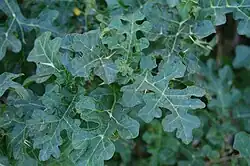 Střídavě vyrůstající, jakoby papírové listy s 2 cm řapíkem mají čepel dlouhou 5 až 13 cm a širokou 4 až 9 cm, v obryse vejčitou a pravidelně peřenodílnou až peřenosečnou. Čepel je na bázi klínovitá a má po dvou až třech párech úkrojků, jež jsou obvejčité laločnaté, zaoblené a řídce porostlé hvězdicovitými chlupy na kratičkých stopkách. Na střední i některých postranních žilkách obou stran listů vyrůstají až 12 mm dlouhé ostny. Listy jsou zbarvené světle zeleně až žlutozeleně a sušením hnědnou.