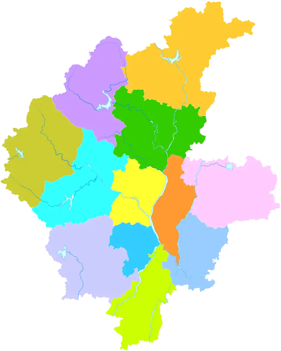 Městská prefektura Lin-i se člení na dvanáct celků okresní úrovně, a sice tři městské obvody a devět okresů.