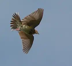 Vábí drsným „psip“. Při zvučném zpěvu složeném z několika odlišných hlasitých trylků vzlétá z vrcholu stromu, stoupá do výše, a poté s šikmo nahoru rozevřeným ocasem a volně visícíma nohama padá na jiný strom.[2][3]