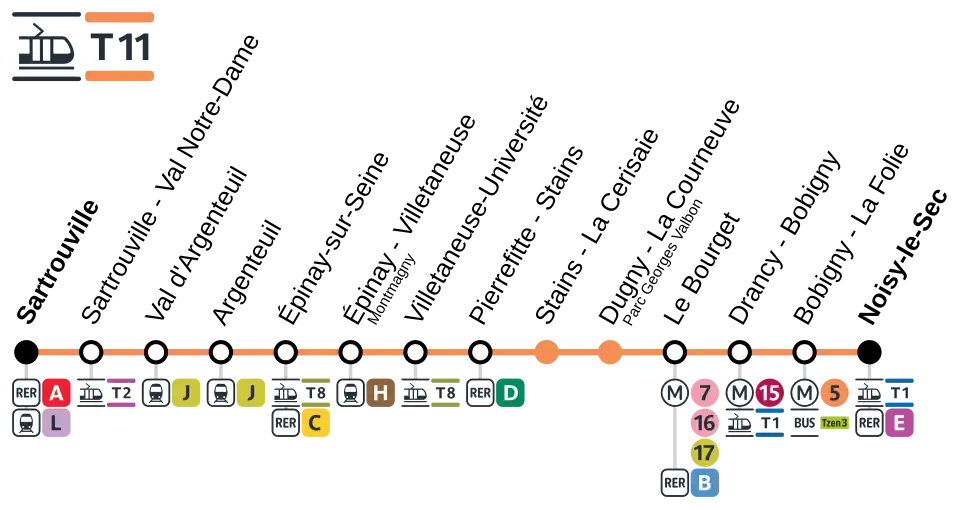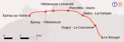 Trať je dlouhá 11 kilometrů a vede podél Grande Ceinture, což je železniční obchvat Paříže využívaný především nákladními vlaky. Linka spojuje města Épinay-sur-Seine, Montmagny, Villetaneuse, Pierrefitte, Stains, Dugny, La Courneuve, Le Bourget a Drancy v departementech Seine-Saint-Denis a Val-d'Oise severně od Paříže. Cesta z konečné na konečnou zabere 15 minut, průměrná vzdálenost mezi zastávkami je 2 150 metrů.