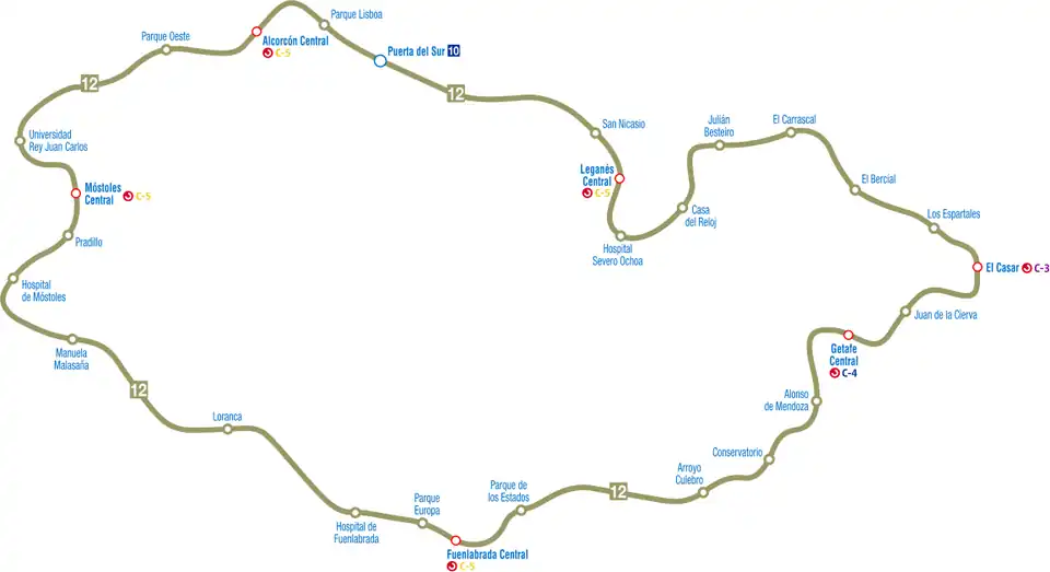 Linka spojuje významná města jižní madridské aglomerace a propojuje do té doby radiální železniční tratě, po kterých jezdí madridská příměstská železnice Cercanías. Přestupní stanice se železnicí je v každém z obsluhovaných měst a tyto stanice jsou významnými přestupními uzly. Jediný přestup na jinou linku metra je ve stanici Puerta del Sur, a to konkrétně s linkou 10. Soupravy pro linku 12 vyjíždějí z depa Loranca.