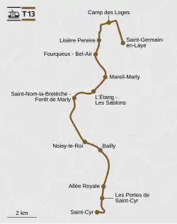Trať je 19 km dlouhá a spojuje města a obce Saint-Germain-en-Laye, Mareil-Marly, L'Étang-la-Ville, Saint-Nom-la-Bretèche, Noisy-le-Roi, Bailly, Versailles a Saint-Cyr-l'École v departementu Yvelines západně od Paříže. Průměrná vzdálenost mezi zastávkami je 2000 metrů a cesta z konečné na konečnou zabere 32 minut. Centrum údržby se bude nacházet ve Versailles u jižní konečné a napojeno bude 700 metrů dlouhou manipulační tratí.
