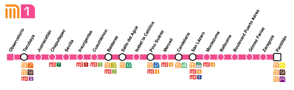 Linka 1 se kříží s linkami metra 2, 3, 4, 5, 7, 8, 9, A, B a linkami Metrobusu 1, 2, 3, 4, 5, 7.