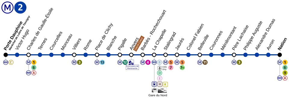 Linka 2 je druhá nejstarší linka Pařížského metra a v systému MHD je značena modrou barvou. Linka byla postavená v letech 1900–1903 a spojuje stanice Porte Dauphine na západě města a Nation na východě. Spolu s linkou 6 vytvářejí okružní linku.