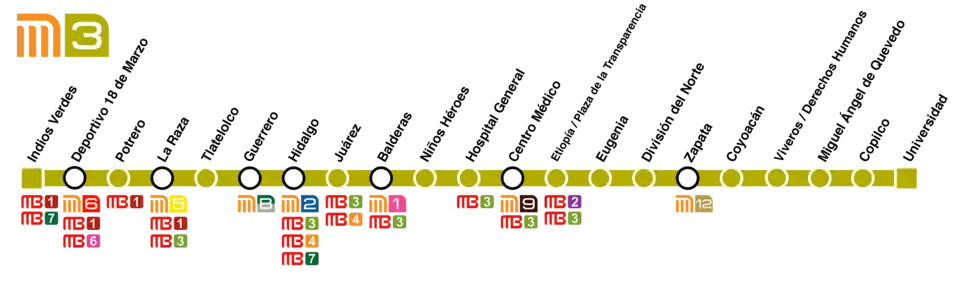 Linka 3 se kříží s linkami metra 1, 2, 5, 6, 9, B, 12 a linkami Metrobusu 1, 2, 3, 4, 6, 7.