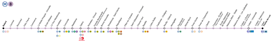 Linka 8 je nejdelší linka pařížského metra (delší už jsou jen linky RER), která je v systému MHD značena světle fialovou barvou. Vede od stanice Balard na jihozápadním okraji Paříže přes centrum a po obloukové dráze končí ve stanici Pointe du Lac jihovýchodně od Paříže na území města Créteil. Linka je dlouhá 23,4 km, má 38 stanic a ročně přepraví 89,1 miliónů cestujících (2004).