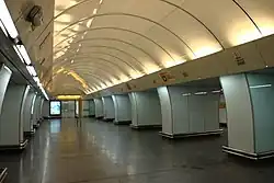 Stanice je založena 39 m hluboko a je dlouhá 111,5 metrů. Na nástupišti je 15 párů prostupů mezi loděmi, s ostěním montovaným z železobetonových tybinků. Konstrukce stanice umožňuje časem prodloužit střední loď jižním směrem tak, aby byl vybudován druhý eskalátorový tunel s výstupem u ulic Lazarská nebo Vodičkova.