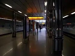 V prostoru nástupiště podpírají strop dvě řady sloupů. Dostatek světla zajišťuje přes den jednak prosklená jižní stěna za nástupištěm, jednak i zasklené světlíky vycházející ze stropu nástupiště, v noci pak dvě řady osvětlení, umístěné na stropě u obou kolejí. Obklad stěn tvoří keramické dlaždice v tmavě šedé barvě, strop je obložen bílými obklady kovovými.