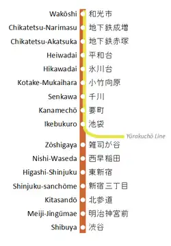 - Ikebukuro, přestup na linky Jamanote, Saikjó a Šónan-Šindžuku společnosti JR East, linky metra Júrakučó a Marunouči společnosti Tokyo Metro, linku Tóbu Todžo soukromé společnosti Tóbu a linku Seibu Ikebukuro soukromé společnosti Seibu