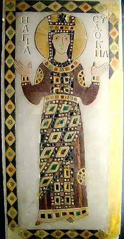 Při vykopávkách v letech 1929 a 1960 bylo nalezeno velké množství fragmentů ornamentálně vyřezávaných desek, říms, archivolt, sošek orlů, intarzovaných destiček a glazovaných dlaždic. Mezi nimi byla i kompletní intarzovaná ikona svaté Eudocie z 10. století. Také glazované dlaždice s malovanými rostlinnými a geometrickými ornamenty patří do 10. století a byly pravděpodobně použity jako obruby a rámy. Skupina fragmentů s vyřezávanými bustami apoštolů patřila k archivoltě, pravděpodobně vyřezaná pro jednu z arkosolií.[2]