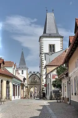 Menší věž je rovněž hranolová s půlkruhově zaklenutým průchodem, zakončená čtyřbokou jehlancovou střechou s makovicí a břidlicovou krytinou. Na levém boku menší věže vede segmentově zaklenutý vchod na cimbuří.