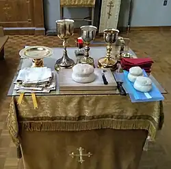 - Svaté přijímání. Kněz v oltáři pozdvihuje proměněného Beránka s voláním: „Svaté svatým!“ Poté připravuje svaté Dary k přijímání. Nejprve přijímá duchovenstvo v oltářní části, věřící zatím zpívají duchovní písně nebo čtou modlitby před svatým přijímáním. Následně kněz vychází z oltáře svatými dveřmi a nese kalich, ve kterém jsou svaté Tajiny Těla a Krve Kristových, aby rozdílel přijímání věřícím.