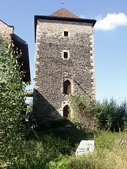 Brána statku, vlevo lze vidět Památník tří odbojů -