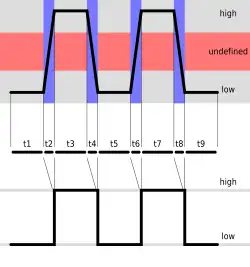 Přechod mezi dvěma logickými úrovněmi musí proběhnout rychle, protože prochází zakázaným pásmem. Označujeme jej jako „hranu signálu“ (v grafu znázorněno modře). Pokud spínací hrany nejsou dostatečně ostré, nebo pro potřebu převodu analogového signálu na digitální signál může být použit Schmittův obvod.
