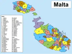 Attard, Balzan, Birgu (Vittoriosa), Birkirkara, Birżebbuġa, Bormla (Cospicua), Dingli, Fgura, Floriana, Għargħur, Għaxaq, Gudja, Gżira, Ħamrun, Iklin, Isla (Senglea, Città Invicta), Kalkara, Kirkop, Lija, Luqa, Marsa, Marsaskala (Wied il-Għajn), Marsaxlokk, Mdina (Città Notabile), Mellieħa, Mġarr, Mosta, Mqabba, Msida, Mtarfa, Naxxar, Paola (Raħal Ġdid), Pembroke, Pietà, Qormi (Città Pinto), Qrendi, Rabat, Safi, San Ġiljan (St. Julian's), San Ġwann, San Pawl il-Baħar (St. Paul's Bay), Santa Luċija, Santa Venera, Siġġiewi (Città Ferdinand) , Sliema, Swieqi, Tarxien, Ta' Xbiex, Valletta, Xgħajra, Żabbar (Città Hompesch), Żebbuġ (Città Rohan), Żebbuġ, Żejtun (Città Beland), Żurrieq