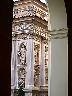 4 sochy: Delfská a libyjská Sibyla, prorok Jeremjáš a Ezechjáš. Reliéfy: Zvěstování a Navštívení Panny Marie.