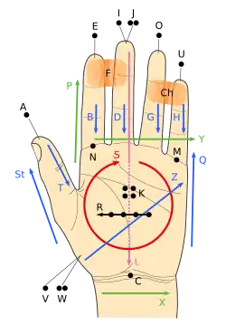 - použít značení jako v Braillově písmu: 1=A, 2=B, 3=C, 4=D, 5=E, 6=F, 7=G, 8=H, 9=I, 0=J, před číslicí použít tah obráceného „L" (dlouhá čára od zápěstí po bříško prostředníčku)