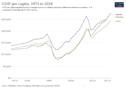 Po roce 1990 došlo k prudkému propadu ekonomiky a transformace dolehla na celé Pobaltí těžce. Hrubý domácí produkt byla v roce 1995 o 26 % nižší než v roce 1980.[72] V polovině 90. let se ale obnovil růst, který se značně dynamizoval po vstupu do Evropské unie v roce 2004. Růst byl tak prudký, že někteří odborníci hovořili o přehřátí ekonomiky. Rychlý růst HDP a příjmů obyvatelstva vedl k výraznému zvýšení spotřebitelské poptávky, následné inflaci a současně k růstu schodku běžného účtu a zahraničního dluhu. Varovný byl růst cen nemovitostí, který v jisté chvíli dosahoval až 5 procent měsíčně. Patrně proto globální ekonomická krize zastihla lotyšskou ekonomiku jako velmi zranitelnou a propad byl největší v Evropské unii.[73] Spektakulárním byl pád druhé největší lotyšské banky Parex Bank, u níž se dlouhodobě spekulovalo o napojení na ruskou mafii a kruhy kolem Vladimira Putina.[74] Hospodářství stačilo snížit svůj rozpočtový deficit, ale zahraniční dluh zůstal nad sedmdesáti procenty HDP a zmenšil tak prostor pro překonání krize.[75] Nezaměstnanost v roce 2010 byla 22,5 %, nejvyšší v celé Evropské unii. Nicméně kolem roku 2012 se křivky otočily a Lotyšsko se vrátilo k růstu. Okolo roku 2015 se Lotyšsko vrátilo na předkrizovou úroveň a pokračuje v růstu.