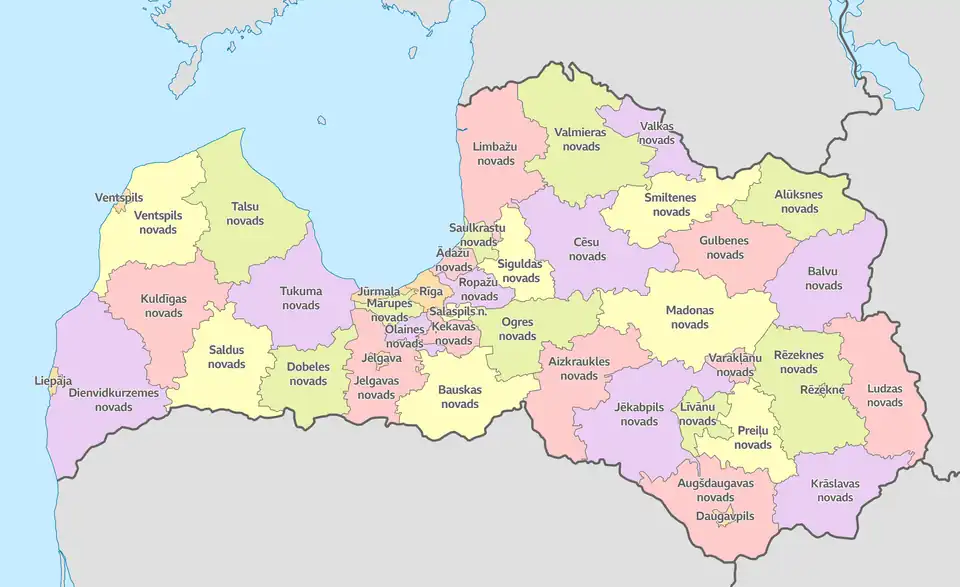 K datu 1. července 2021 se Lotyšsko nově a na nejvyšší úrovni dělí na 36 krajů (novadi, jednotné číslo novads) a 7 státních měst (Valstspilsēta). V porovnání s Českou republikou mají lotyšské kraje spíše rozlohu českých okresů a někdy bývají i takto chápány.