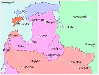 Dnešní lotyšské hlavní město Riga, které bylo založeno roku 1201 německými kolonisty v ústí řeky Daugavy, se stalo strategickou základnou při dobývání okolního území Livonským řádem. Riga se stala prvním velkým městem na jižním Baltu a vytvořila úzké kulturní vazby se západní Evropou. Po roce 1282 se stala důležitým obchodním centrem Hanzy.[17] Hanzovními městy se staly i Cēsis, Limbaži, Koknese a Valmiera. Od 16. století se německou dominanci v oblasti snažily narušit okolní velmoci.