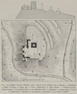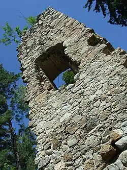![]() Zřícenina věže (vlevo) a paláce | |