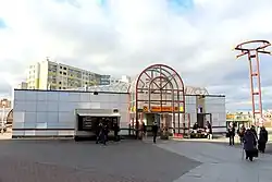 Stanice je hloubená, budovaná v jámě 7 m hluboko[1], s nástupištěm podpíraným pilíři a se stropními světlíky, zastřešenými skleněnou střechou na úrovni povrchu. Výstup je jen jeden, východním směrem, vedoucí přímo na povrch a do sídliště a dále k přilehlé autobusové zastávce. S nástupištěm je spojený pevným schodištěm. Na nástupišti jsou dekorativní palmy, umístěné ve skleněných kopulích v místech pod světlíky. Stěny jsou obloženy bílým dekorativním sklem a částečně i nerezovými prvky.