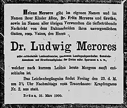 - ↑ a b c d Dr. Ludwig Merores. Neue Freie Presse. Březen 1900, čís. 12778, s. 2. Dostupné online.