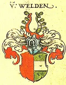 S celou početnou rodinou byl v roce 1806 povýšen do stavu svobodných pánů.[15] Jako příslušník starého šlechtického rodu byl v roce 1808 jmenován c. k. komořím[16] a v roce 1847 obdržel titul c. k. tajného rady s nárokem na oslovení Excelence.[17] Od roku 1849 byl čestným majitelem pěšího pluku č. 20 dislokovaného v Krakově.[18] Během své vojenské kariéry získal několik vyznamenání v Rakousku i v zahraničí,[19] mimo jiné byl nositelem dvou stupňů prestižního Řádu Marie Terezie.[20][21] Ve vídeňské čtvrti Favoriten je po něm pojmenována ulice Weldengasse.
