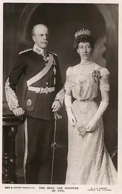 Dva dny po svatbě jej královna Viktorie jmenovala vévodou z Fife a markýzem z Macduffu v titulu peera Spojeného království. Patent o zřízení tohoto vévodství obsahoval standardní odkaz legitimním dědicům mužského pohlaví.[10] 24. dubna 1900 po narození jejich dvou dcer královna Viktorie podepsala patent o zřízení druhého vévodství z Fife spolu s hrabstvím Macduff v titulu peera Spojeného království se zvláštním odkazem: v případě, že se nenajde mužský dědic, přejdou tyto tituly na dcery 1. vévody a poté na jejich mužské potomky.