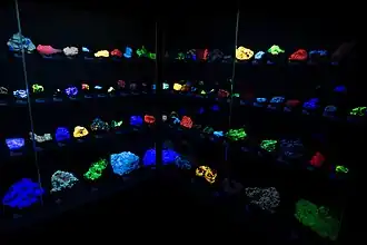 Ukázka fluorescence minerálů v ultrafialovém záření (Sál luminiscence v Národním muzeu v Praze)