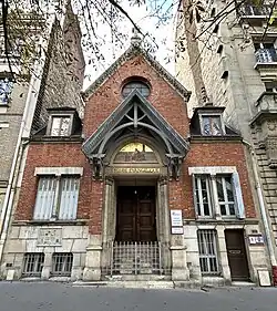 Fasáda je z růžových cihel, jako soulad se strážnicemi u vchodů do parku Buttes-Chaumont. Ve čtvrti La Villette fungovalo v 19. století mnoho cihelen. Portál je chráněn dřevěným přístřeškem, pokrytým drobnými taškami. V tympanonu je mozaika Martina Guiberta, kde je na zlatém pozadí Ježíš Nazaretský, Marie a apoštol Petr. Níže je umístěn nápis église évangélique (evangelický kostel).