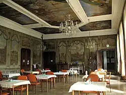 V prvním patře hlavního křídla se nachází první sál s malbami. Sál je situován na východ od dvouramenného klasicistního, hlavního schodiště. V této veliké obdélné místnosti se šesti vchody a okny nalezneme na plochém stropě fresky zobrazující antické a starozákonní výjevy. Uprostřed stropu se dle Bareše nachází hostina Mene tekel peres.[16] Na stěnách můžeme obdivovat klasicistní fresky zpodobňující pohledy na francouzská města a zámky. Strop tohoto sálu je dekorovaný raně barokními freskami. Uprostřed vidíme alegorický cyklus zpracovávající příběh Adama a Evy.