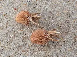 Plod je obvejčitá dvounažka asi 5 mm velká, sestává ze dvou merikarpů (nažek či semen) a je částečně obalená vytrvalými kališními lístky. Semena jsou pokrytá štětinkami s háčky, jež umožňují přichycení k srstí či peří zvířat. Občas bývá suchá lodyha s dozrálými plody odlomená a je hnána větrem po mořském břehu a přitom rozsívá semena, stává se tzv. stepním běžcem.