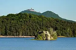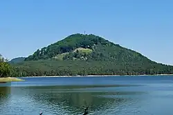 Pohled na jezero z Malé pláže ve Starých Splavech, v pozadí Bezděz | |