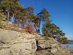 Na severním břehu se nachází tzv. Jarmilina skála, odkud podle pověsti skokem do jezera ukončila svůj život Jarmila, jedna z ústředních postav básně Máj od Karla Hynka Máchy. V letech 1936–1938 zde stál Máchův pomník, po záboru Sudet devastován místními henleinovci, shozen do jezera, vyzvednut Čechy a převezen do Bělé po Bezdězem.[25] Jarmilina skála je v současnosti nepřístupná, neboť se nachází v areálu městské pláže Staré Splavy, který má od města dlouhodobě pronajat podnikatel Roman Vyštějn.[26]