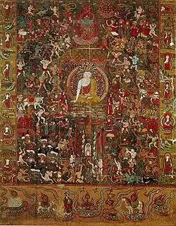 Mára, jeho chtivé dcery a démonická armáda pokoušející Buddhu, ikona z 10. století z jeskyní Mogao