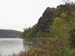 Na protějším břehu Vltavy se nachází Libčická skála vysoká přes 30 m na jejímž vrcholu se nacházejí zbytky zříceniny hradu Liběhrad. Ve skále vybíhají tři vyvřelé horniny: tmavozelený proterozoický spilit, který je proražen mohutnou žílou světle šedého jemnozrnného masivního žulového porfyru a obě tyto horniny pak prostupuje asi 1 m mocná, šikmo probíhající žíla horniny bohaté tmavou slídou – biotitem.[5]