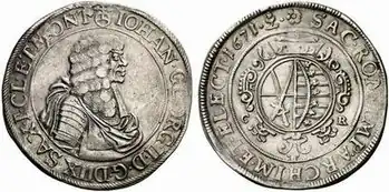 Výměnný tolar byl zaveden za kurfiřta Jana Jiřího II. (1656–1680) podle výměnného či burgundského tolarového rázu (861/1000). Tento tolar a jeho díly byly zamýšleny jako podpora lipského obchodu s Hamburkem a Nizozemskem.[34] Na prvních ražbách z roku 1670 je proto na zadní straně nápis WECHSELTHALER.[35] Výměnný tolarový ráz platil v Saském kurfiřtství v letech 1670–1671.