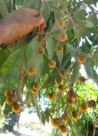 Plody jsou masité, žluto až červeno oranžové, poloprůhledné peckovice kulovitého tvaru o průměru cca 2,5 cm. Obsahují tmavohnědé nebo černé lesklé semeno s tvrdým osemením. Plody se objeví v červenci a srpnu a zrají asi 4 měsíce. Ozdobné plody zůstanou po dozrání na stromě další měsíc.