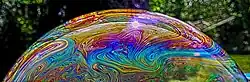 Mýdlové bubliny během své krátké existence mění svoji tloušťku a padají k zemi. Když na bublinu svítí světlo, zdá se, že neustále mění barvu. Barvy viditelné v mýdlové bublině vznikají z interference světelných vln odrážejících se od předního i zadního povrchu tenkého mýdlového filmu. Výsledná barva je kombinací všech odrazů světla.[3]