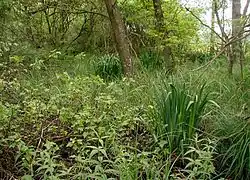 Bylinné patro je tvořeno vlhkomilnými, nitrofilními druhy, jako je bršlice kozí noha, svízel přítula, kopřiva dvoudomá, lilek potměchuť, kostival lékařský nebo hluchavka skvrnitá; z travin se vyskytují ostřice ostrá a štíhlá, chrastice rákosovitá nebo rákos obecný. Charakteristické jsou pnoucí liány (chmel otáčivý, opletník plotní); výrazným prvkem jarního aspektu jsou žlutě kvetoucí orseje a blatouchy. Na trvale zamokřených místech najdeme rostliny vázané na vodu, jako např. žabník jitrocelový nebo kosatec žlutý. Mechové patro je vyvinuto jen slabě, případně vůbec.[1][2]