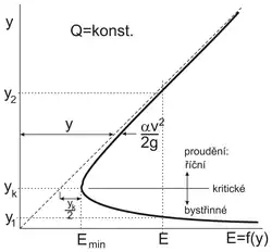 , bude grafem funkce křivka, jejíž jednou asymptotou je tedy osa , druhou asymptotou pak přímka . Křivka má dále minimum pro jistou hodnotu hloubky (tzv. kritickou hloubku). Tato kritická hloubka je jednak rozhraním mezi pohybem říčním (čili podkritickým) pro hloubky a pohybem bystřinným (čili nadkritickým) pro hloubky , jednak hloubkou samostatného režimu proudění, tzv. proudění či pohybu kritického (). Při kritickém pohybu tedy proudění prochází daným profilem s minimem energie.