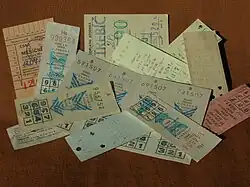 Nejprve bylo jízdné placeno v hotovosti. Samoodbavovací systém využívající znehodnocovací strojky na jízdenky, původem maďarské, byl zaveden od 1. ledna 1980.[60] Používání jednorázových jízdenek pořizovaných v automatech nebo u smluvních prodejců bylo opuštěno v lednu 1993, kdy se zavedl nástup pouze předními dveřmi, jízdné se vhazovalo za dohledu řidiče do kasičky, jízdenka se nevydávala.